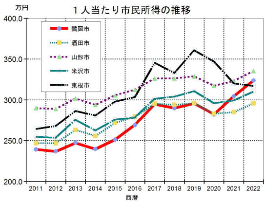 一人当たり市民所得、鶴岡市は県下2位に浮上