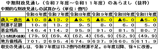鶴岡市が3月に公表した「中期財政見通し」(下表)では、令和7年度は13・2億円の財源不足で、その後徐々に改善します。