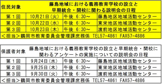 藤島地域の義務教育学校の設立に関して、小学校の早期統合についてのアンケート実施が、9月24日~30日の保護者対象の説明会で示されました。