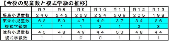 今後の児童数の推移では、東栄小学校の児童数が、現在の62人から6年度には26人に減ることから、廃校による地域存続が課題です。