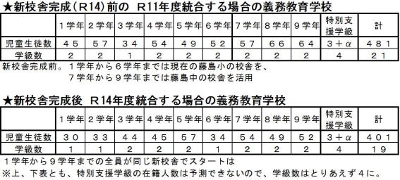 説明会の資料によれば、新校舎完成(R14)前の令和11年度に、現在の藤島小と藤島中の校舎を活用し、施設分離型で義務教育学校を発足させ、14年度に同じ新校舎でスタートする案が示されています。