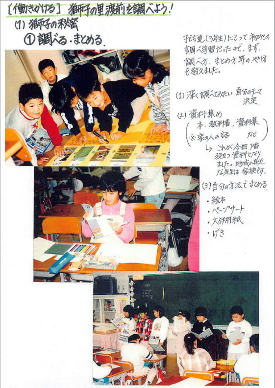 3年生のテーマを、「ぼくたちの住む地域を知る」と設定し、実践1として「さぐろう!〝獅子の里渡前〟」としました。