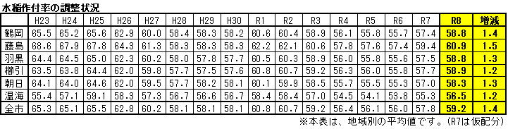 12月1日に県から示された鶴岡市の令和8年産米の「生産の目安」は、数量で前年比1766t増(+3・33%)の5万4682t、面積換算で前年比254ha増(+2・86%)の9148haとなりました。