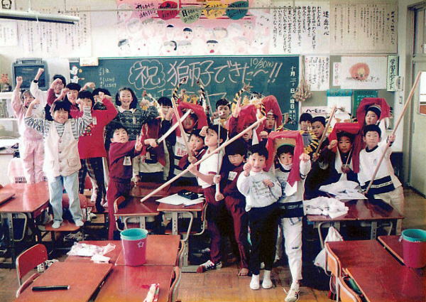 早速、役場から本物の獅子頭を借りて、子ども達に見せました。