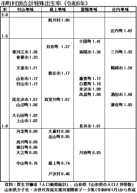 山形県の合計特殊出生率は、令和6年度1・17で、市町村別では鮭川村が1・90で最も高く、次いで庄内町が1・62、三川町が7番目の1・35、鶴岡市は10番目の1・20でした。