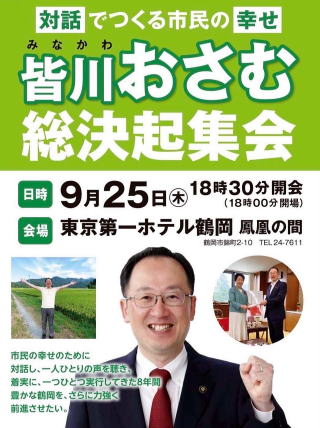 鶴岡市長選挙に向けて、「皆川おさむ総決起集会」が25日(木)、18時30分から東京第一ホテル鶴岡で開催されます。