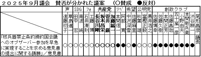 「核兵器禁止条約締約国会議へのオブザーバー参加を早急に実現することを求める意見書の提出に関する請願」(漆山永吉氏)は、共産党市議団など14人が賛成、自民会派などの11人が反対し、賛成多数で採択、意見書が可決されました。