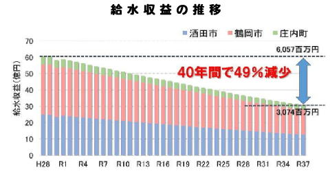 人口減少等の影響から、給水収益は令和37年度には、平成28年度と比較して半減すると見込まれ、水道施設の稼働状況の低下や、老朽化、職員の技術継承等が大きな課題となっていました。