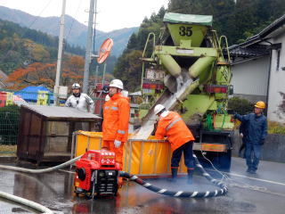 消防団の消火訓練では、水利が不足する際のコンクリートミキサー車の補水訓練も実施されました。