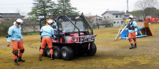総務省消防庁から貸与された救助工作車から「水陸両用バギー」が出動し、倒壊家屋の負傷者救助訓練。