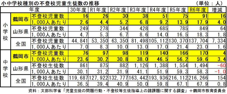 鶴岡市でも、小学校で16人増え91人に、中学校で4人増え170人と、あわせて260人を超え、過去最多となっています。
