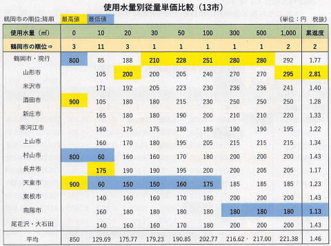 従量単価比較では、使用水量が多くなると単価が上がる逓増制になっているため、30㎥から500㎥までの単価は、13市で鶴岡市が一番高くなっています(表)。