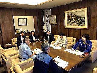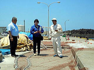 2019年6月18日の山形県沖地震で、鼠ヶ関漁港や温海小岩川で被害状況の説明を受け、副市長らと懇談(6月20日)