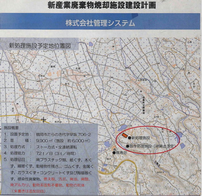 計画しているのは、同地内で産廃焼却処理事業をおこなっている(株)管理システム(本社・酒田市)の鶴岡支店「アール・イー・シー」です。