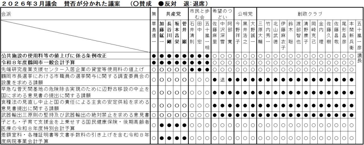 会派間で争点になった、市職員の選挙関与に関する請願や、辺野古移設中止、食糧法見直し中止の請願は、反対多数で不採択となり、武器輸出禁止を求める意見書案は否決されました(表参照)。
